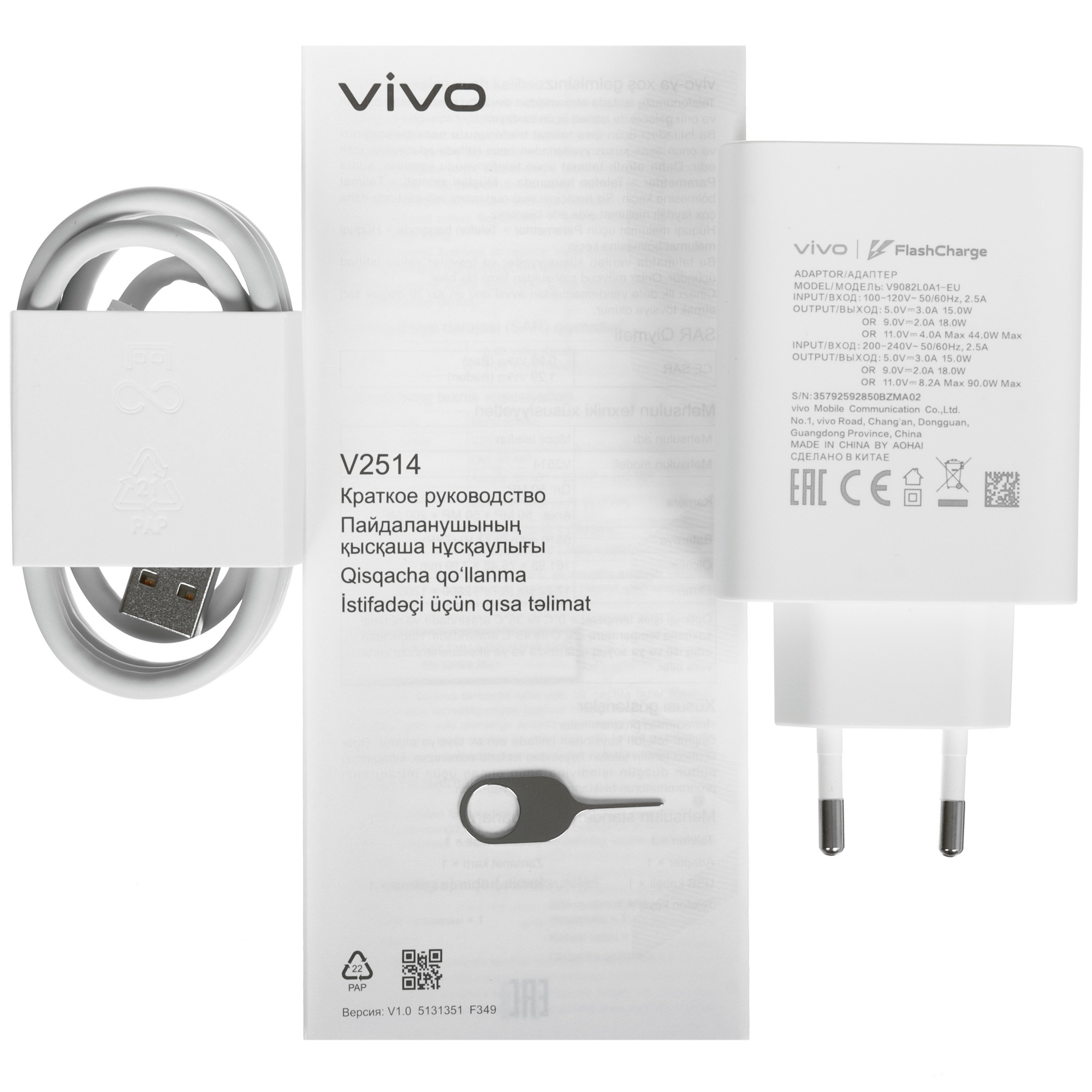 документация, зарядное устройство, защитная пленка (наклеена на экран), кабель USB Type-C, скрепка для извлечения слота SIM-карты / карты памяти, чехол