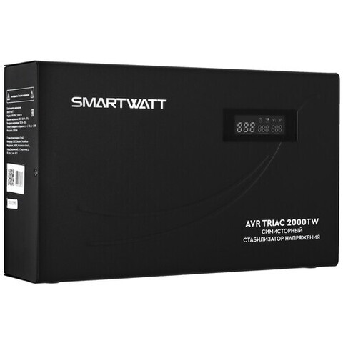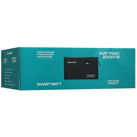 Однофазный стабилизатор напряжения SMARTWATT AVR TRIAC 2000TW оборудован двумя евророзетками и предохранителем. Его основная функция — защита устройств от колебаний напряжения, что позволяет сохранить данные на компьютере. Устройство оснащено двумя видами задержки запуска: долговременной (180 секунд) и короткой (6 секунд). Охлаждение происходит естественным образом. На ЖК-дисплее стабилизатора отображаются значения входного и выходного напряжения, уровень нагрузки и информация о возможных аварийных ситуациях.