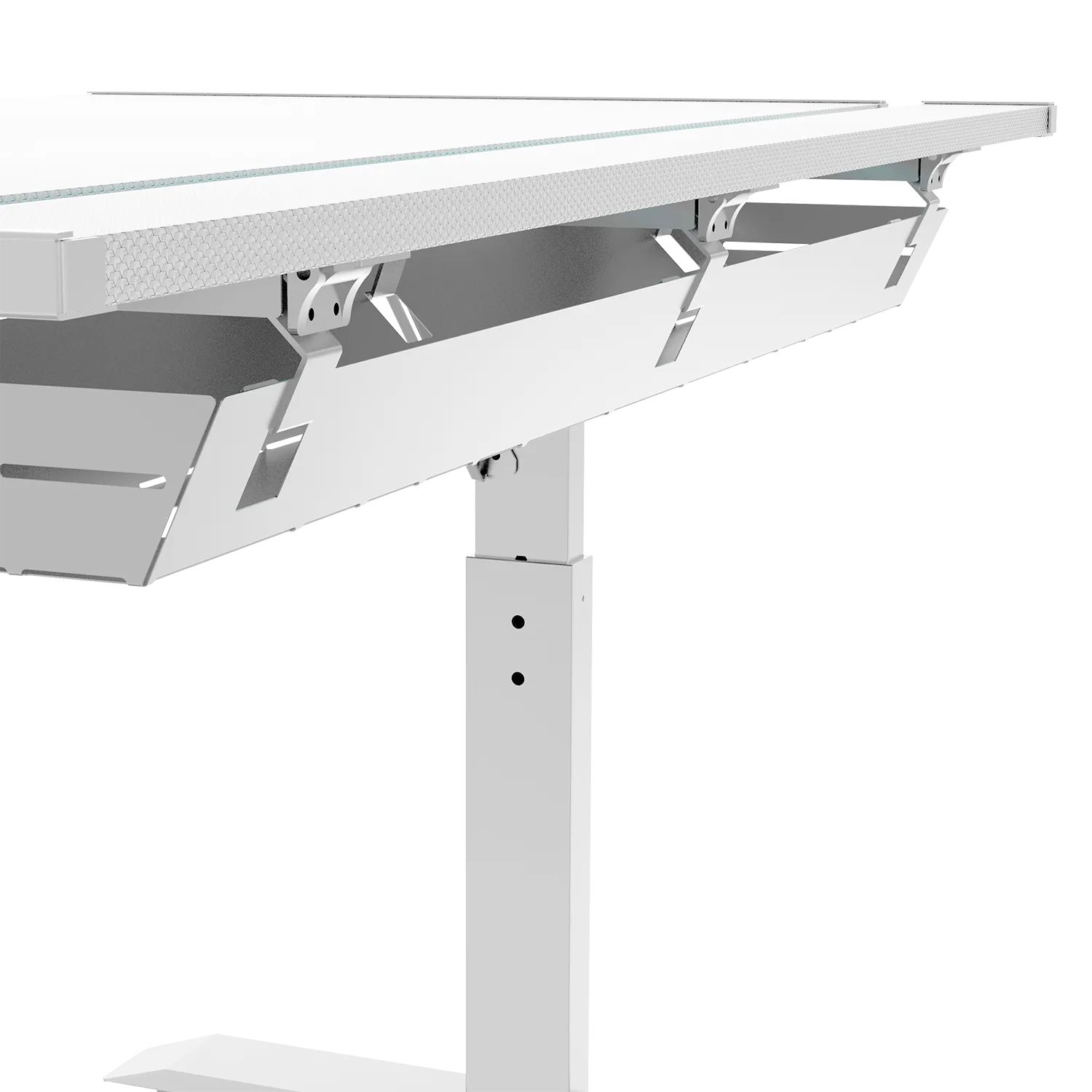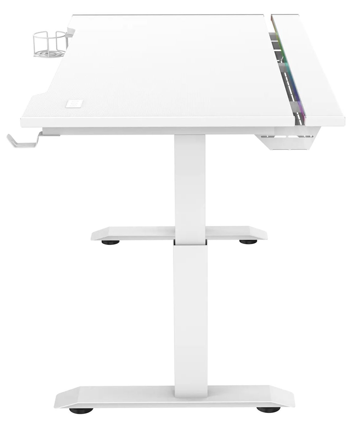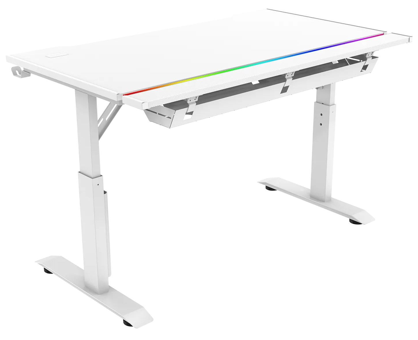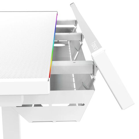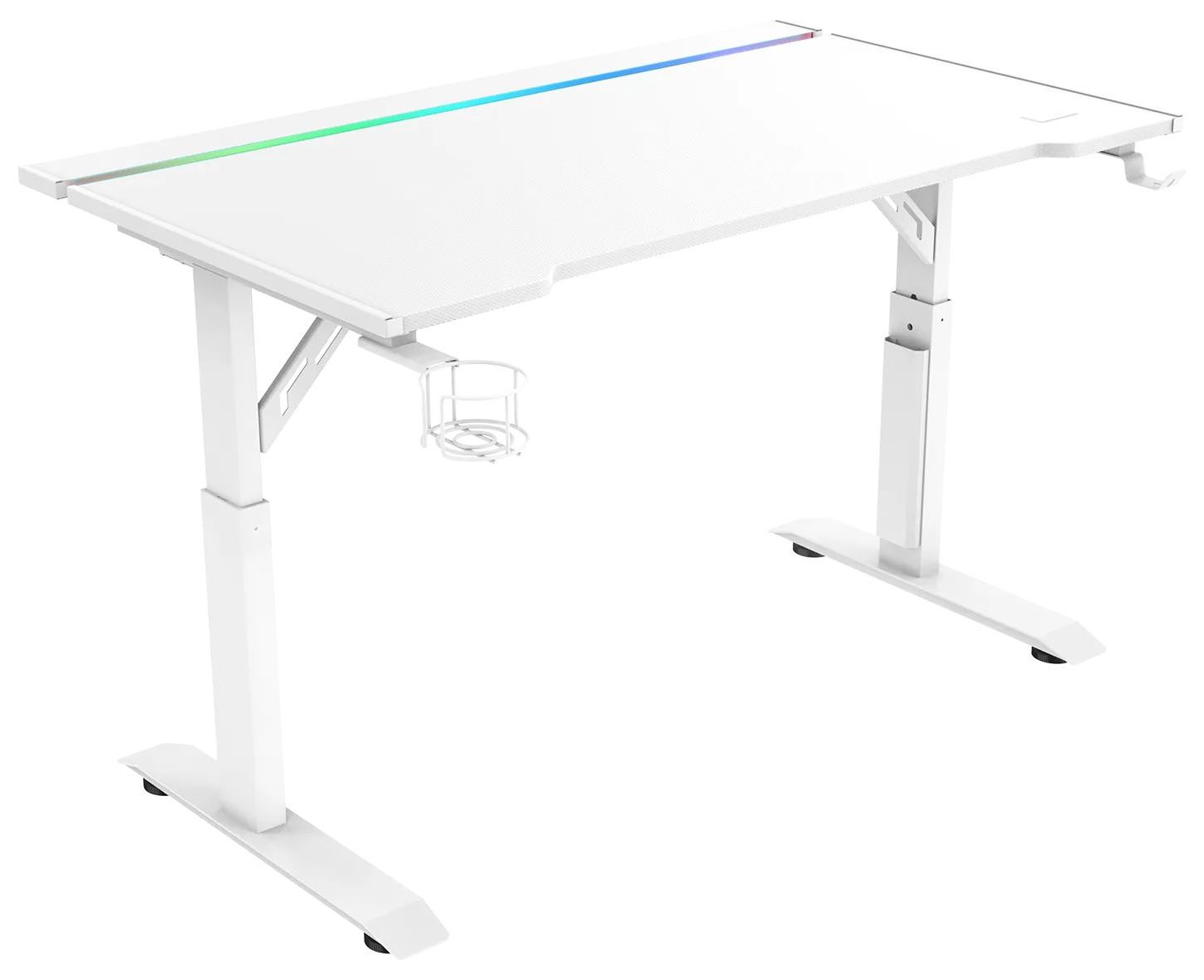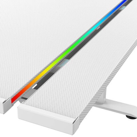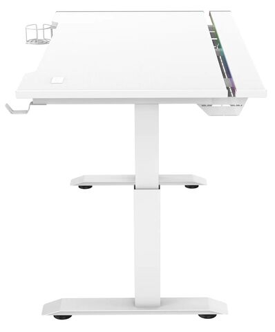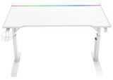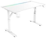 Игровой стол ZONE 51 RUNWAY 120 белого цвета имеет эргономичный вырез для комфортного размещения в кресле перед компьютером. В столе предусмотрена откидная панель для размещения проводов. Размеры столешницы (120x71 см) позволяют разместить монитор, колонки, клавиатуру, мышь, лампу и другие устройства. В комплекте также есть крючок для наушников и устойчивый подстаканник. Стол регулируется по высоте и оснащен RGB-подсветкой, подключаемой через USB.