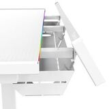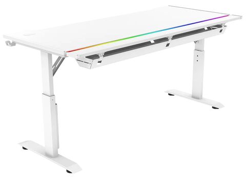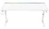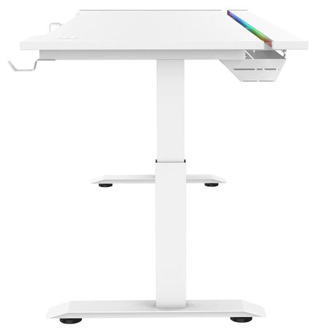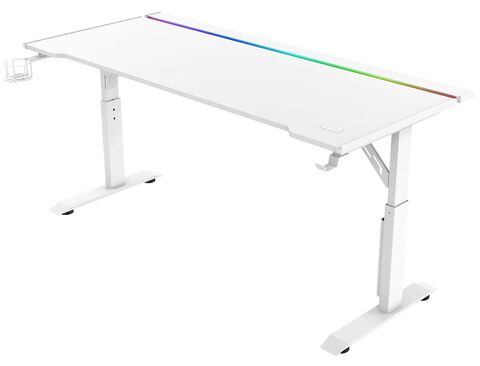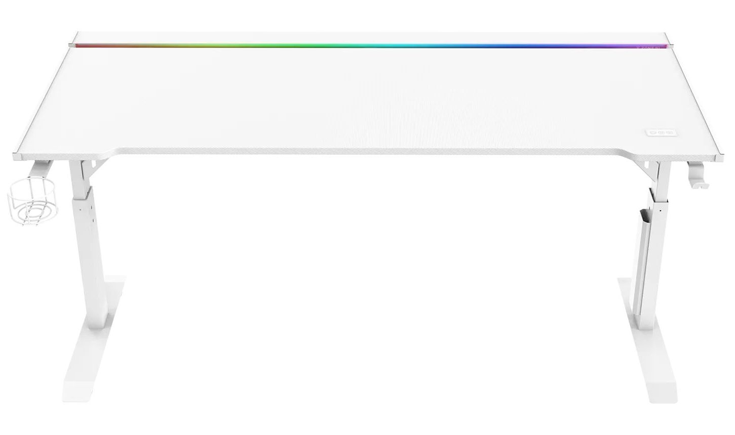 Модель RUNWAY 160 представляет собой белый игровой стол с эргономичным вырезом, который позволяет удобно разместиться в кресле перед компьютером. Откидная панель под столешницей предназначена для скрытия проводов. Размеры столешницы составляют 160x71 см, что достаточно для размещения монитора, колонок, клавиатуры, мыши, лампы и других аксессуаров. В столе предусмотрены крючок для наушников и подстаканник, который не опрокинется. Высота ножек регулируется, а RGB-подсветка подключается через USB-порт.
