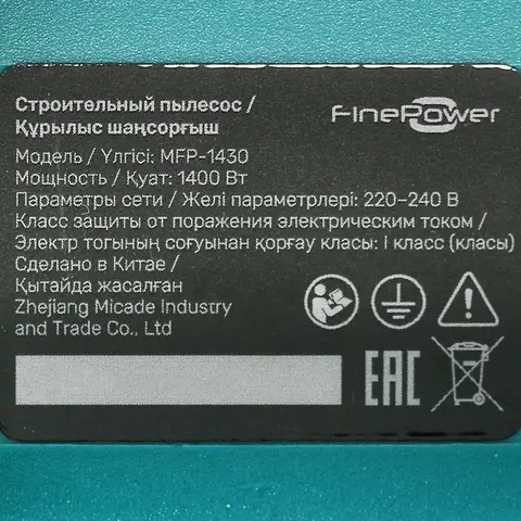 Строительный пылесос FinePower MFP-1430 с мощностью 1400 Вт эффективно собирает мусор и удаляет пролитую жидкость. Устройство совместимо с электроинструментами. Легкость перемещения по рабочей зоне обеспечивают встроенные колеса. Для работы требуется подключение к сети 220 В через 5-метровый шнур.