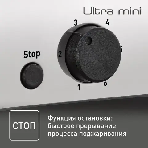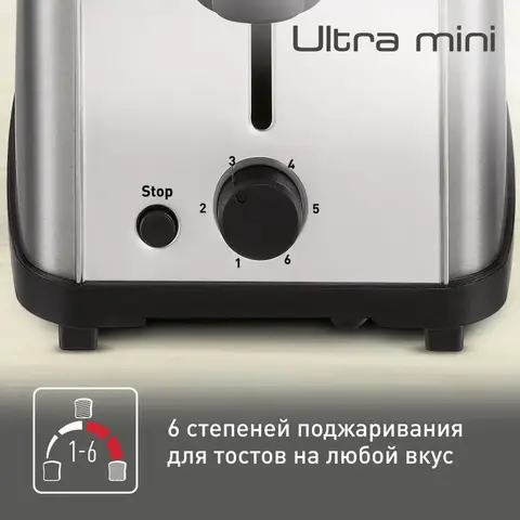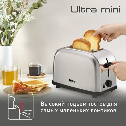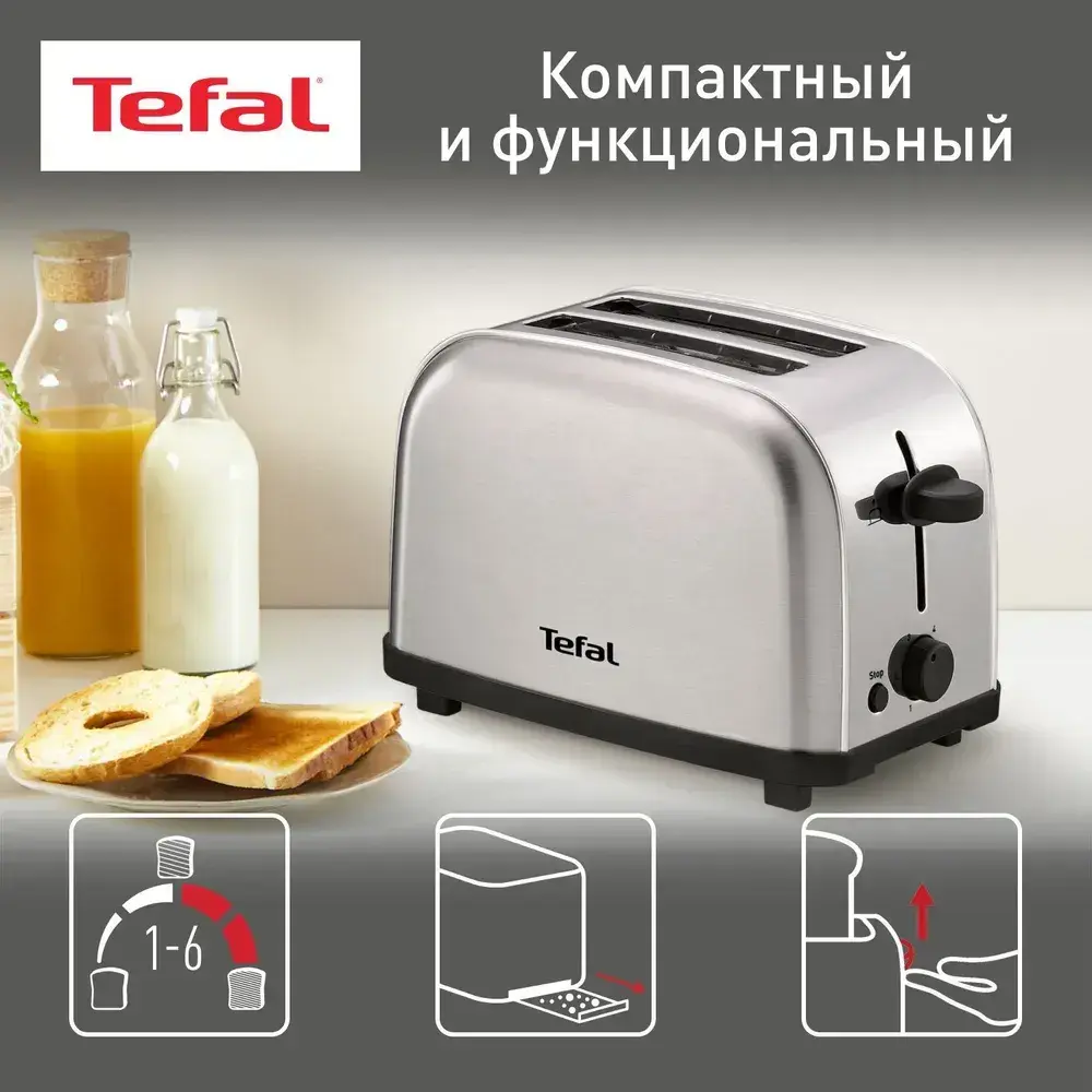 Тостер Tefal TT330D3 — это ультракомпактная модель мощностью 850 Вт. В нём есть два отделения с решётками, которые автоматически центрируют ломтики разной толщины, не позволяя им соприкасаться с нагревательными элементами. Это обеспечивает равномерное прожаривание. Механический рычаг позволяет поднимать даже небольшие продукты на удобную высоту. Для выбора оптимального температурного режима из шести предложенных вариантов используется механический регулятор с числовой разметкой.