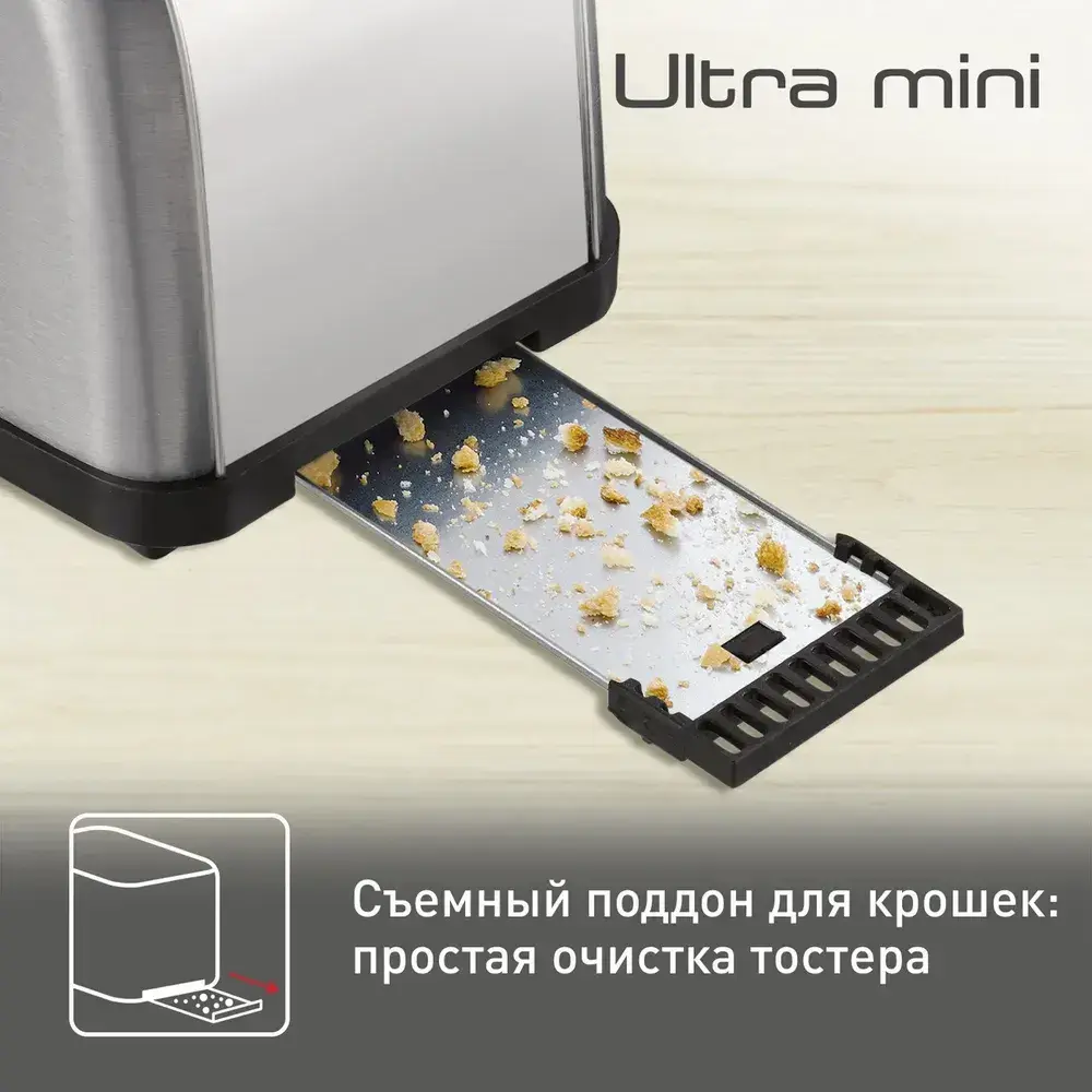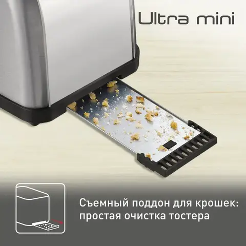 Тостер Tefal TT330D3 отличается комфортом и безопасностью использования. Он оснащён корпусом из нержавеющей стали, который устойчив к механическим повреждениям и не нагревается. Это значительно снижает риск получения ожога при контакте с работающей моделью. Если ломтики хлеба начинают пригорать, процесс приготовления можно принудительно остановить нажатием кнопки «Стоп». Также тостер оснащён съёмным моющимся поддоном для крошек.