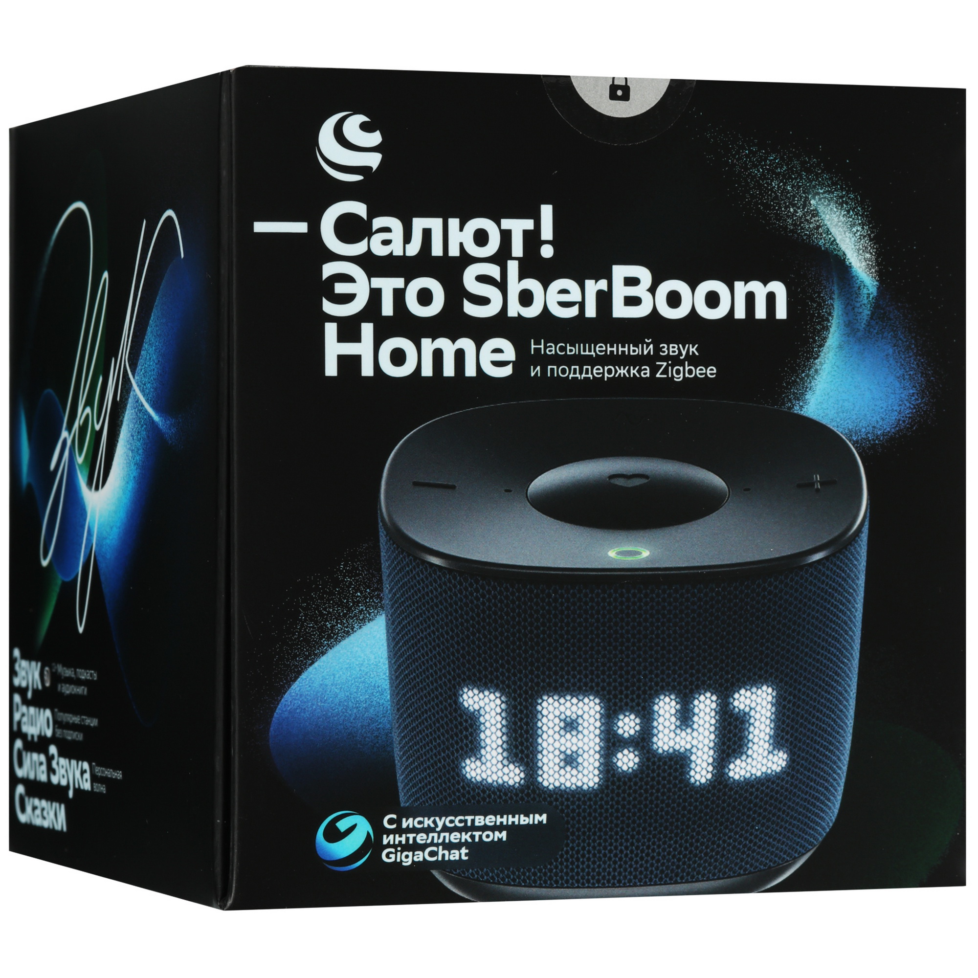 Умная колонка SberBoom Home в синем исполнении, обладающая мощностью 8 Ватт, поддерживает беспроводные подключения через Bluetooth и Wi-Fi. В неё встроен высокочувствительный микрофон, позволяющий управлять колонкой с помощью голосовых команд. Устройство оснащено виртуальным ассистентом, который может включить музыку, предоставить информацию о погоде, заказать еду и управлять умным домом. Управление всеми функциями колонки осуществляется через приложение Сбер Салют. Возможность подключения нескольких смартфонов, планшетов или ноутбуков одновременно позволяет создать многоканальную мультимедийную систему. Объединение двух колонок SberBoom Home позволяет добиться настоящего стереозвука.
