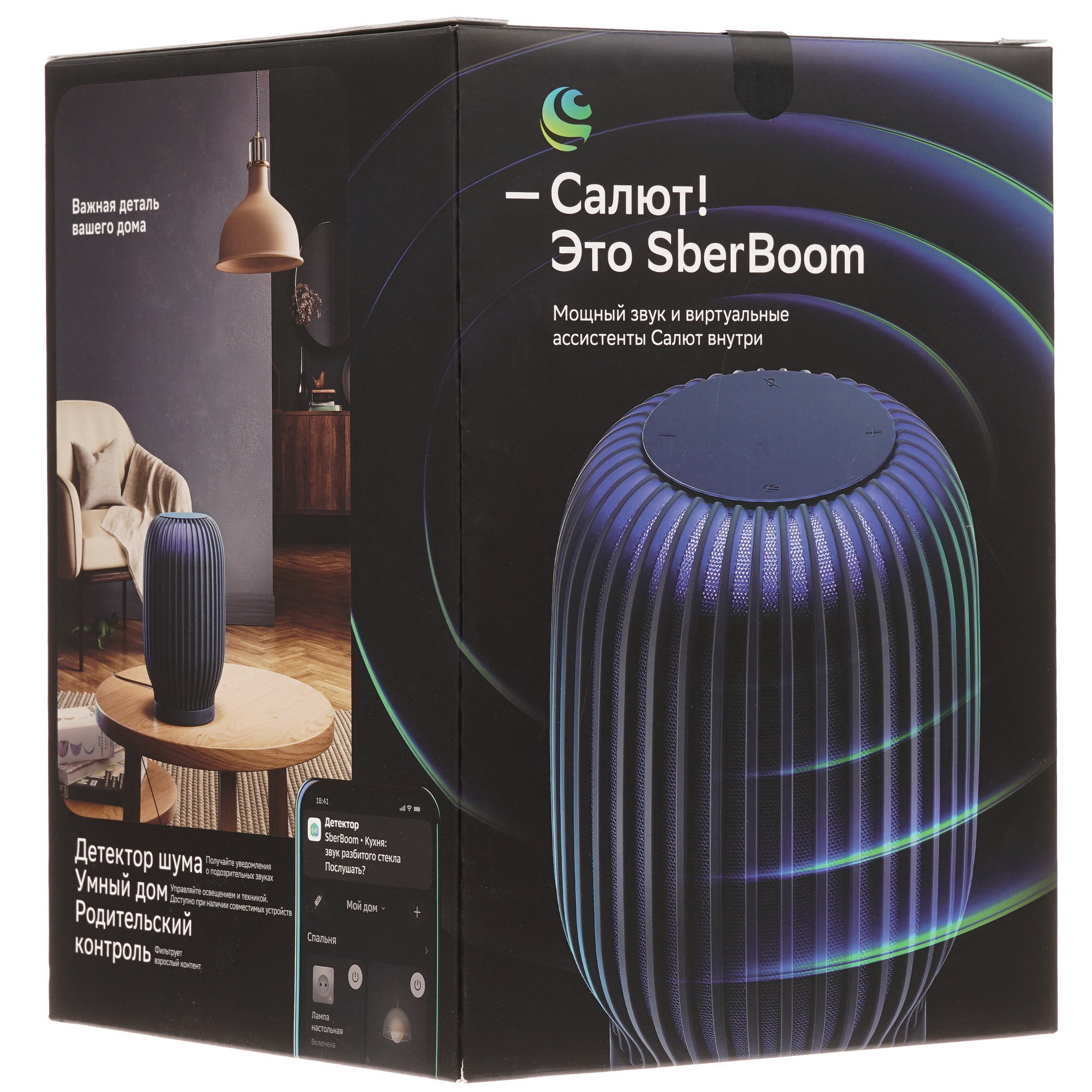 Акустическая система колонки, состоящая из двух динамиков мощностью 40 Вт, обеспечивает высокое качество звука. Для передачи чистого голоса без искажений используется четыре микрофона. Беспроводное подключение к другим устройствам осуществляется через Bluetooth и Wi-Fi. Корпус SberBoom изготовлен из пластика и ткани, а на верхней панели находятся сенсорные кнопки управления.