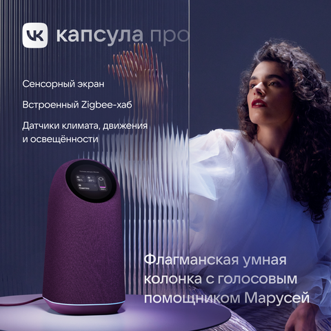 VK Капсула Про — это передовая умная колонка с голосовым ассистентом Марусей и поддержкой умного дома. Она оснащена акустической системой с технологией пространственного звука, включающей три динамика общей мощностью 65 Вт, что обеспечивает глубокое и насыщенное звучание.