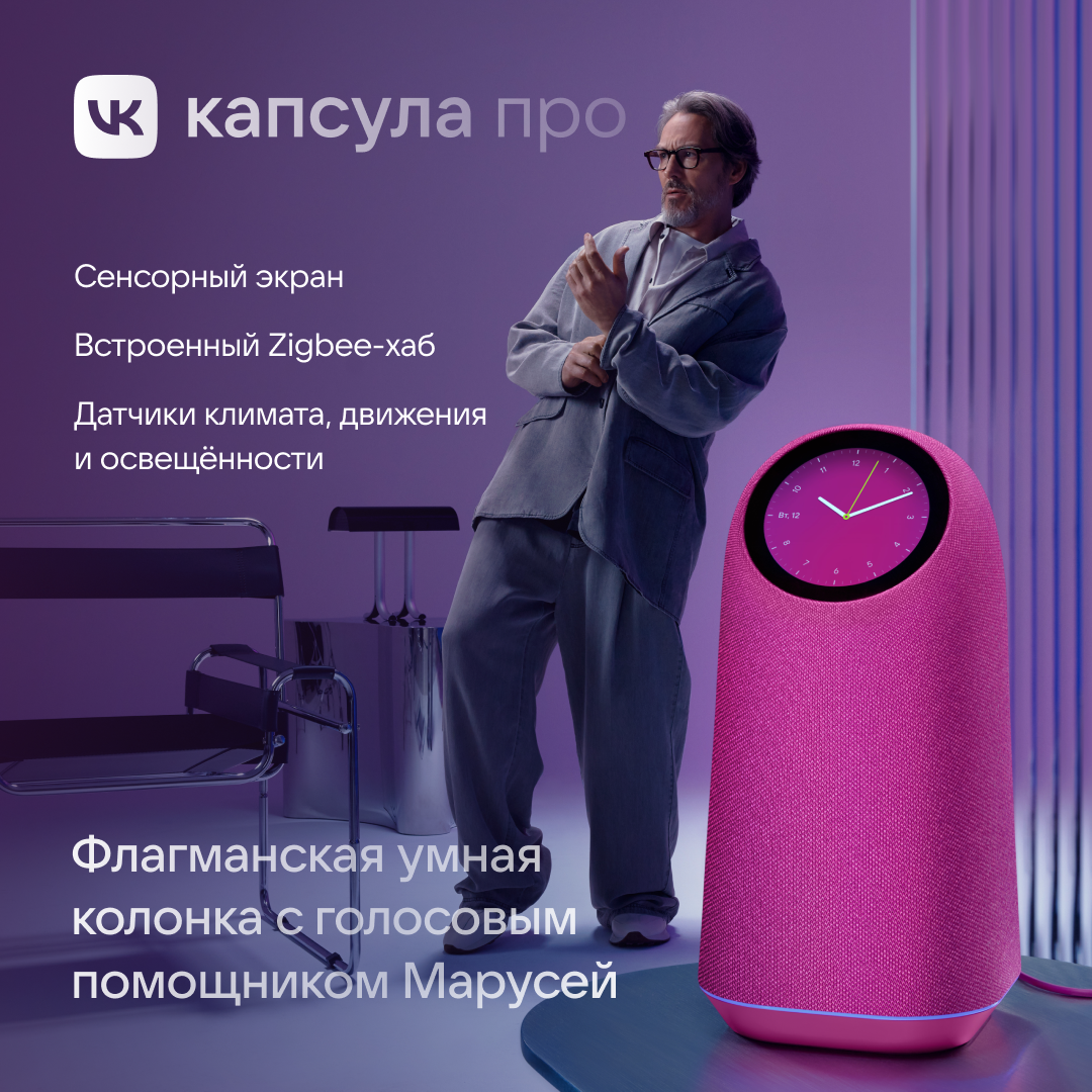 VK Капсула Про — это премиальная умная колонка, оснащённая голосовым помощником Марусей и интегрированная в систему умного дома. Она оснащена акустической системой с пространственным звучанием, включающей три динамика общей мощностью 65 Вт, что позволяет наслаждаться глубоким и насыщенным звуком.