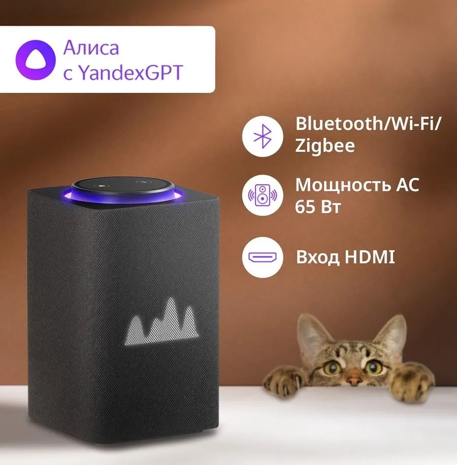 | Особенности | Мощность 65 Вт, 2 Hi-Fi усилителя класса D. Отношение сигнал/шум: 108дБ при 10 Вт. Подключение к ТВ: 4K (поддержка потоковых видеосервисов). Встроенный голосовой помощник Алиса LED-экран монохромный, белый (25x16 пикселей). Мультирум. |