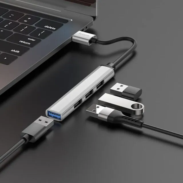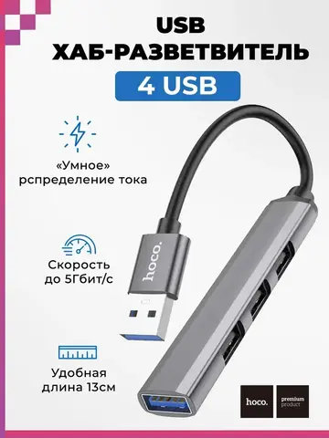 USB-хаб Hoco HB26, оснащённый разъёмом Type-C, расширяет возможности подключения. Он предлагает один порт USB 3.0 и три порта USB 2.0, что позволяет удобно подключать различные периферийные устройства. Этот компактный и стильный хаб обеспечивает высокую скорость передачи данных и совместим с большинством современных гаджетов.