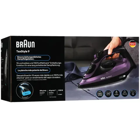 Утюг Braun TexStyle 9 SI9661VI мощностью 3100 Вт легко справляется с самыми стойкими складками. Он подает пар непрерывно в диапазоне от 0 до 60 г/мин, а паровой удар достигает 250 г/мин. Функция Smart iCare автоматически подбирает оптимальную температуру для разных типов тканей, обеспечивая бережный уход.