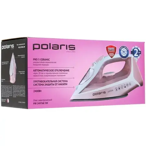 Легкий и функциональный утюг Polaris PIR 2497AK обеспечит комфортную глажку белья и одежды. Керамическая подошва Pro 5 Ceramic способствует легкому скольжению утюга по поверхности ткани, делая ее идеально гладкой. Утюг способен разглаживать даже очень мятые ткани благодаря наличию функций разбрызгивания и парового удара. Вода для этого заливается в специальный резервуар внутри утюга, вместимость которого составляет 300 мл. Противокапельная система предупреждает случайное вытекание воды из отверстий на подошве утюга. Утюг Polaris PIR 2497AK оснащен довольно длинным, 3-метровым, шнуром, за счет чего обеспечивается маневренность во время глажки. Система защиты от накипи и самоочистки исключает появление белого налета внутри резервуара для воды и на некоторых внутренних деталях утюга. Это предполагает длительную и эффективную эксплуатацию электроприбора. При оставлении утюга в горизонтальном положении более чем на 30 секунд он автоматически отключается. В вертикальном положении утюг без использования может оставаться в рабочем состоянии на протяжении 8 минут.