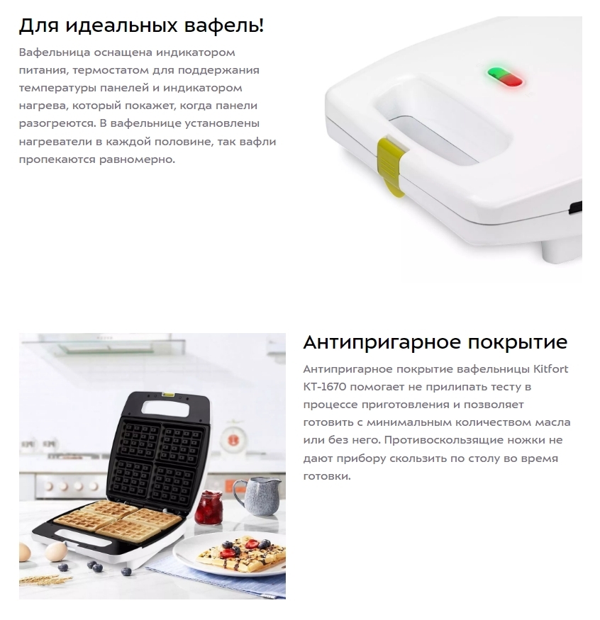 Откройте мир ароматной выпечки вместе с вафельницей KITFORT КТ-1670! Мощность 1400 Вт гарантирует быстрое приготовление, а удобный индикатор подскажет нужный момент. Четырёхсекционное покрытие с антипригарными свойствами обеспечивает идеальную золотистую корочку и лёгкую чистку. Надежные противоскользящие опоры и компактный шнур в 0.8 метра делают её верной помощницей каждой хозяйки!