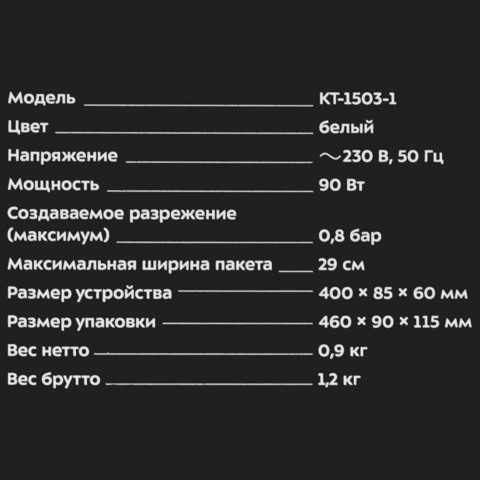 Откройте для себя вакуумный упаковщик Kitfort KT-1503-1! Легкий уход благодаря корпусу из практичного пластика, быстрая чистка после использования. Мощность удивляет — упакует 4 литра еды всего за одну минуту! Особый комфорт обеспечивают механические настройки устройства, а встроенная индикация контролирует процесс работы. Сохраняйте свежесть мяса, рыбы, овощей дольше вместе с Kitfort KT-1503-1!