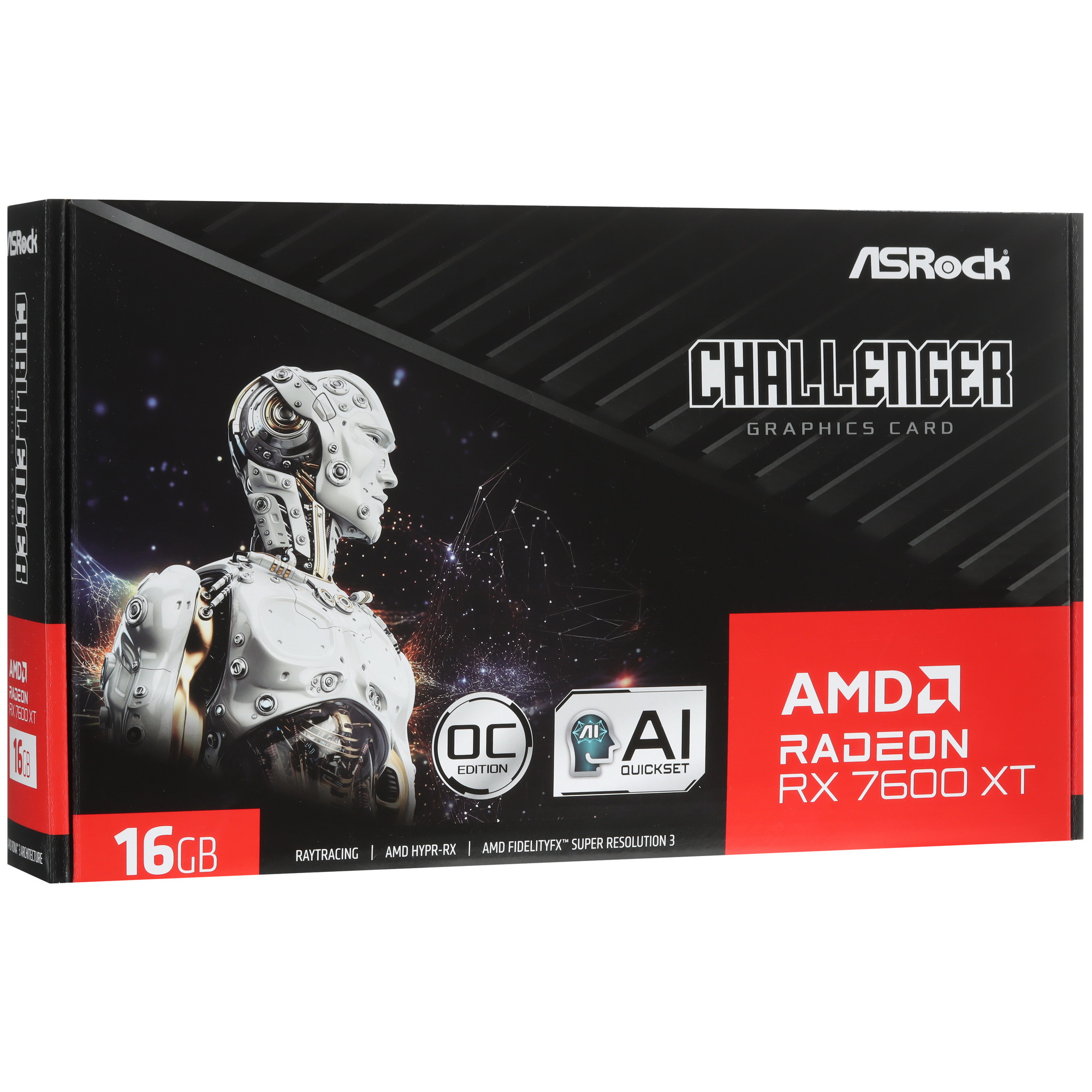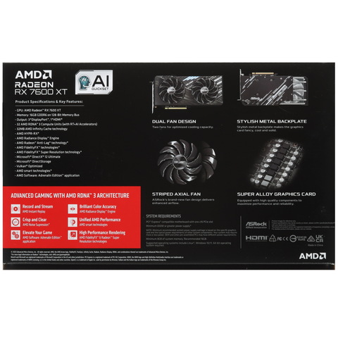 ASRock AMD Radeon RX 7600 XT Challenger OC [RX7600XT CL 16GO] оснащена графическим процессором на базе микроархитектуры AMD RDNA 3 и техпроцесса 6 нм – Radeon RX 7600 XT. Базовая частота GPU составляет 1720 МГц, а турбочастота достигает 2799 МГц. Видеоадаптер имеет 16 ГБ памяти GDDR6 с пропускной способностью 288 ГБ/с и эффективной частотой 18000 МГц. Обмен данными между памятью и GPU ускоряется за счёт 32-мегабайтного Infinity Cache.