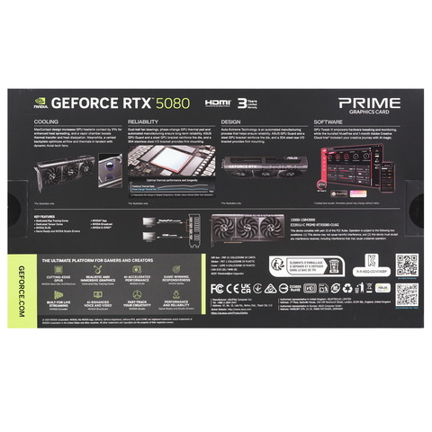 ASUS GeForce RTX 5080 PRIME OC Edition — это видеокарты, созданные специально для разработчиков мультимедийного контента. Они выделяются высокой производительностью, элегантным дизайном, который не привлекает лишнего внимания, и полной совместимостью с большинством корпусов. Кроме того, эти видеокарты работают абсолютно бесшумно, что делает их идеальным выбором для профессионалов.
