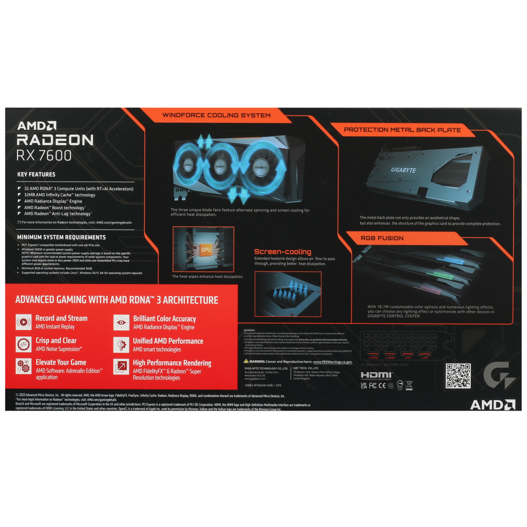 Активное охлаждение с тремя вентиляторами, радиатором и тепловыми трубками обеспечивает стабильную низкую температуру нагрева. Защитная пластина на задней стороне защищает графический адаптер от механических повреждений и деформаций. RGB-подсветка позволяет гибко настраивать параметры освещения и синхронизировать её с совместимыми компонентами. Для вывода изображения в формате до 4K видеокарта GIGABYTE AMD Radeon RX 7600 GAMING OC оснащена двумя разъёмами DisplayPort и HDMI.