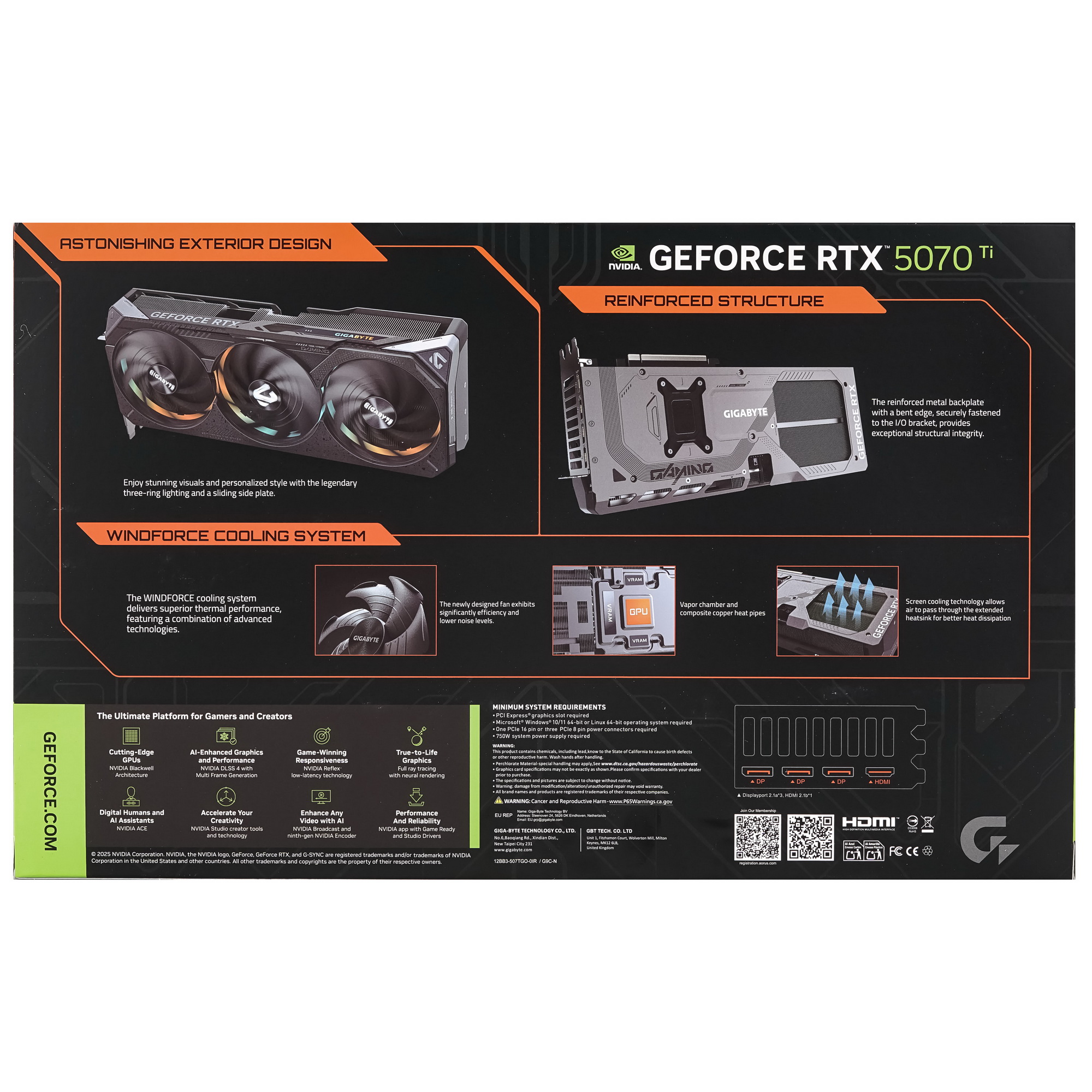 Игровая видеокарта GIGABYTE GeForce RTX 5070 Ti GAMING OC, оснащённая технологией трассировки лучей, значительно улучшает качество графики благодаря реалистичной передаче света и теней. Устройство, оснащённое 16 ГБ памяти GDDR7, поддерживает видео в разрешении 8K и позволяет одновременно работать с четырьмя мониторами. Для предотвращения перегрева видеокарта оборудована тремя кулерами, а также переключателем BIOS и подсветкой.