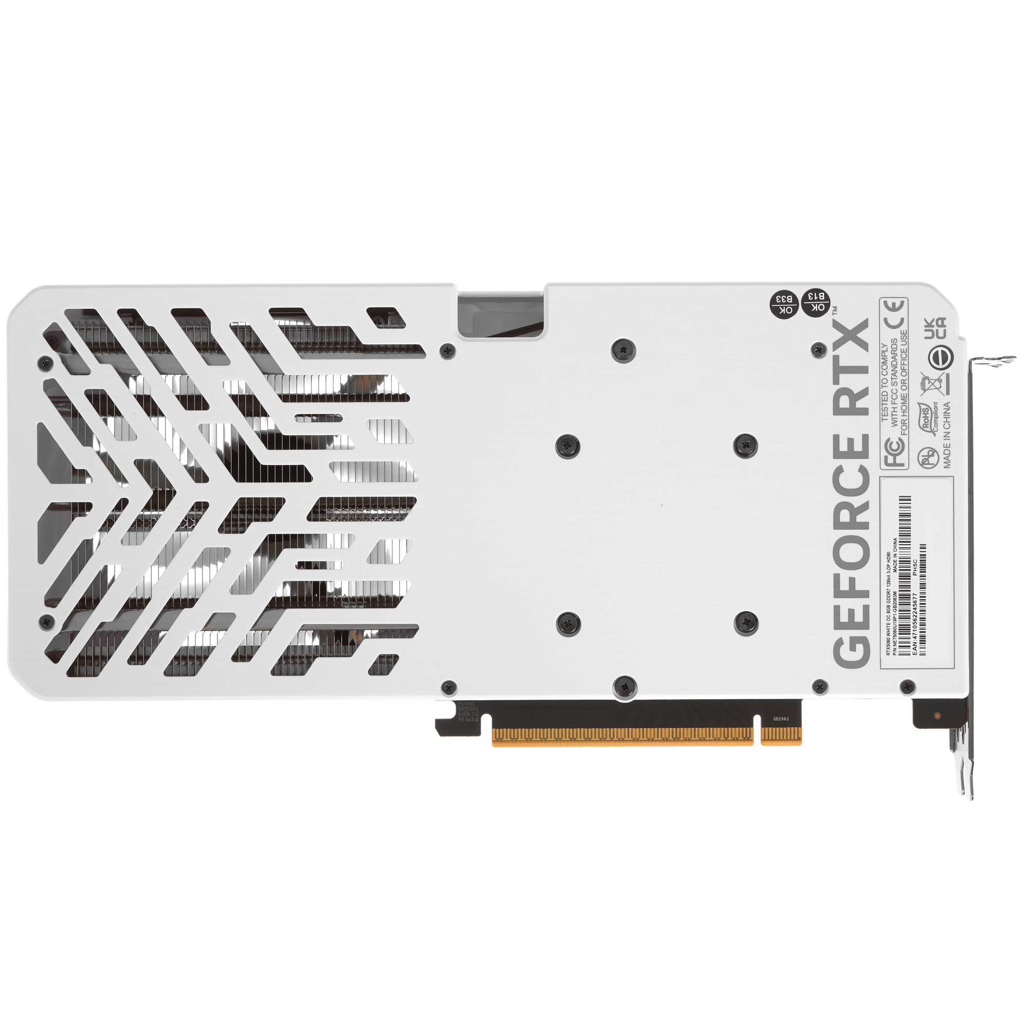 Видеокарта Palit GeForce RTX 5060 White выделяется своей классической системой охлаждения и элегантным белым дизайном. Два 95-миллиметровых вентилятора обеспечивают эффективное охлаждение и работают практически бесшумно, что делает её идеальным выбором для компактных сборок. Прочная белая задняя панель усиливает конструкцию и придаёт устройству стильный вид.
