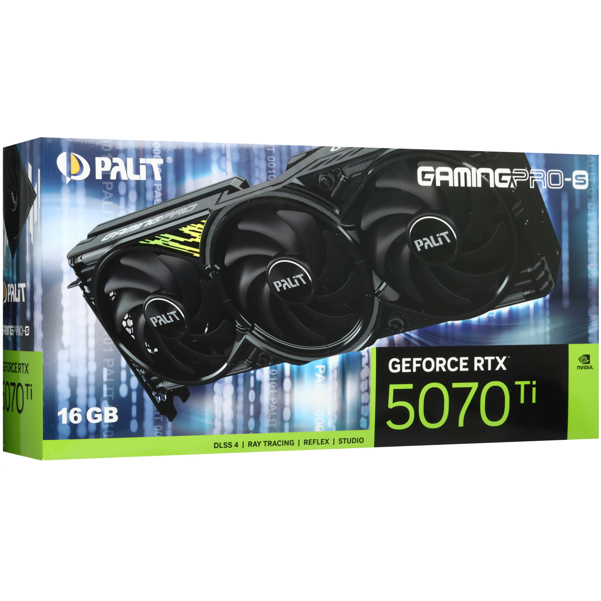 Видеокарта Palit GeForce RTX 5070 Ti GamingPro-S отличается высококачественными компонентами и впечатляющими техническими характеристиками. Она оснащена системой воздушного охлаждения с тремя вентиляторами, которые эффективно рассеивают тепло, обеспечивая стабильную работу устройства. Для подключения мониторов предусмотрены интерфейсы HDMI и DisplayPort, что позволяет легко выводить изображение на различные экраны.