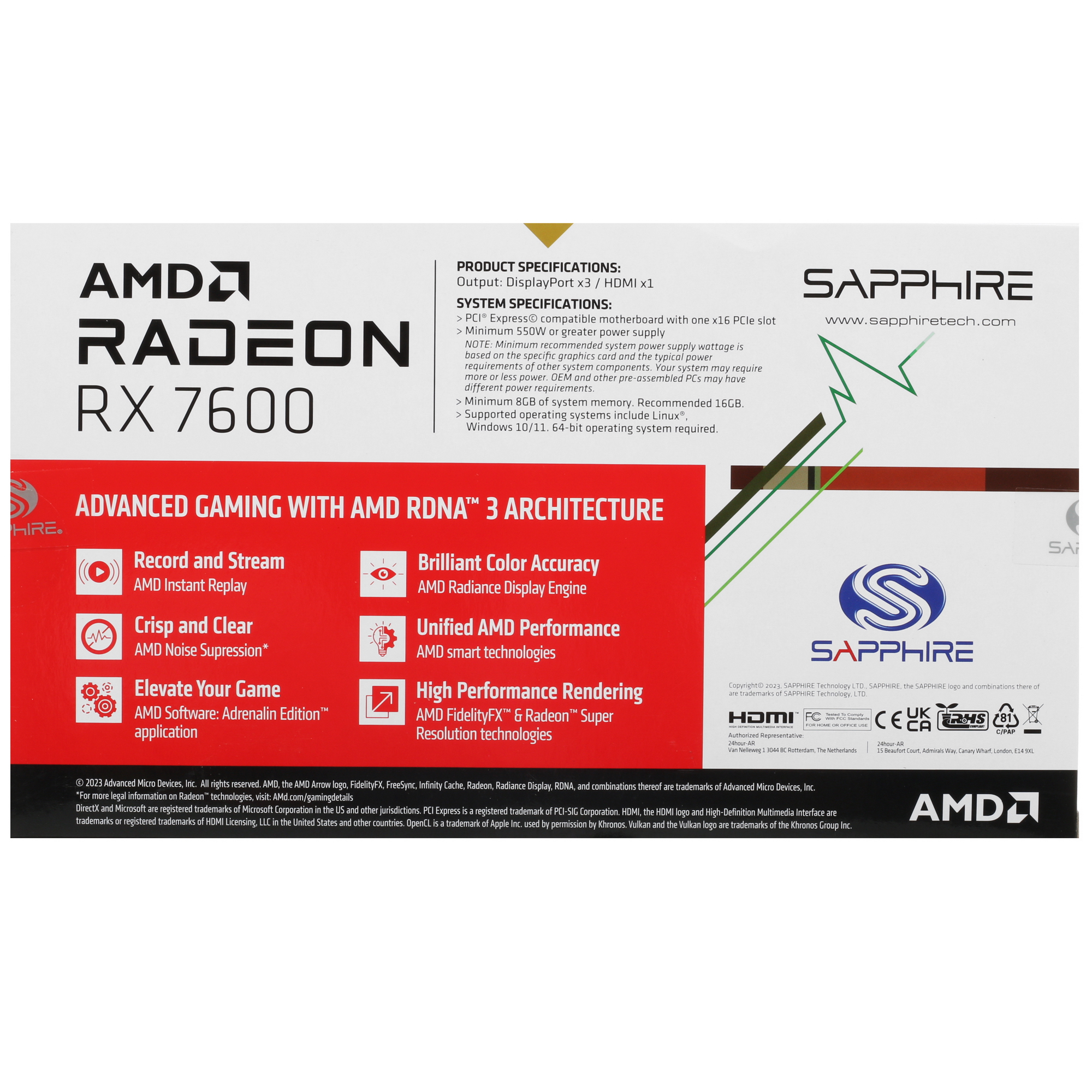 Видеокарта Sapphire AMD Radeon RX 7600 PULSE GAMING OC [11324-01-20G] оснащена мощным графическим процессором Radeon RX 7600 с 8 ГБ GDDR6 памяти и 128-битной шиной. Эта комбинация обеспечивает быструю передачу данных и высокую производительность. Частота графического ядра — 1.77 ГГц — позволяет создавать качественное изображение.