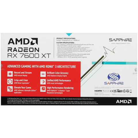 Видеокарта Sapphire AMD Radeon RX 7600 XT PULSE GAMING OC [11339-04-20G] предназначена для сборки и модернизации игровых компьютеров среднего уровня. Она оснащена графическим процессором Radeon RX 7600 XT с базовой частотой 1720 МГц и турбочастотой до 2810 МГц. 16 ГБ памяти GDDR6 с пропускной способностью 288 ГБ/с раскрывают потенциал видеочипа. 32-мегабайтный Infinity Cache ускоряет обмен данными между VRAM и GPU, а 32 RT-ядра обеспечивают аппаратное ускорение трассировки лучей. 2048 универсальных процессоров поддерживают высокое качество графики и плавную частоту кадров.
