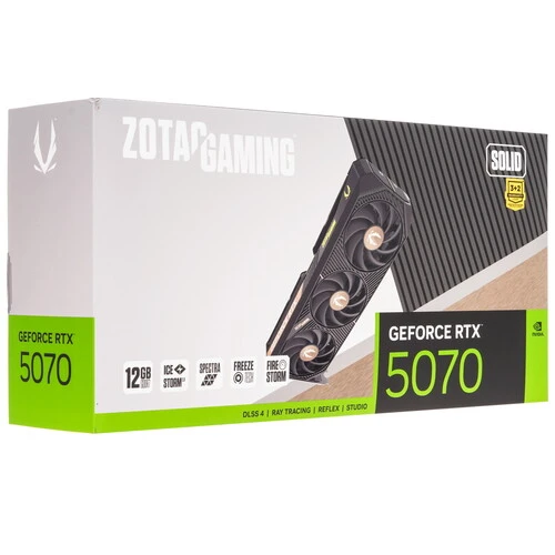 Zotac GeForce RTX 5070 GAMING SOLID — это высокопроизводительная видеокарта NVIDIA SFF-Ready, которая обладает огромной мощью в компактном форм-факторе. Используя передовую архитектуру NVIDIA Blackwell и такие функции, как DLSS4, мощный заводской разгон и впечатляющее охлаждение, SOLID создана прочной и мощной в видеоиграх и профессиональных рабочих нагрузках.