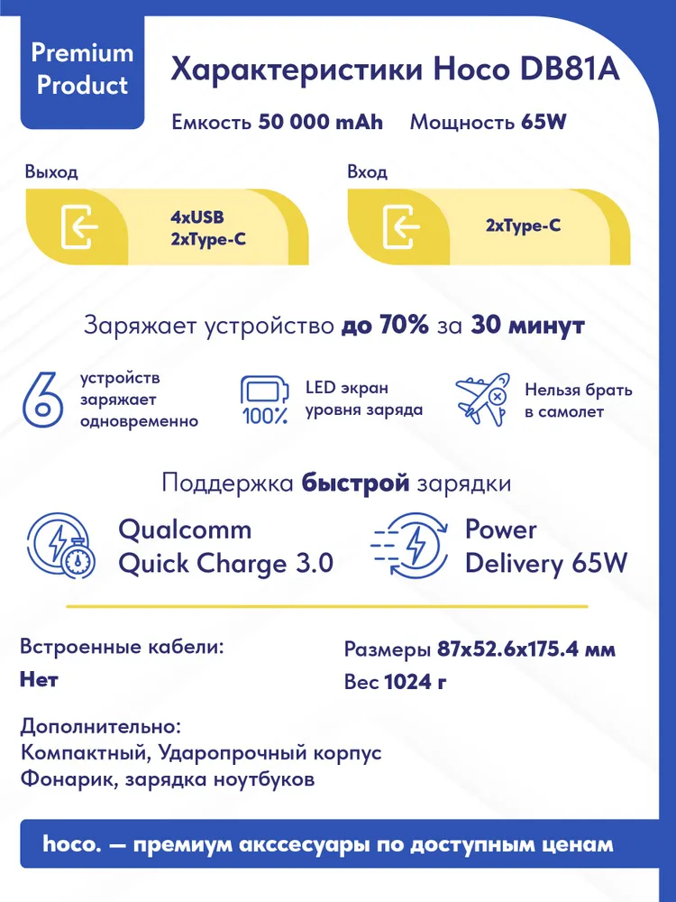 Этот внешний аккумулятор емкостью 50000 мА*ч станет незаменимым спутником для тех, кто ценит мобильность и не хочет остаться без заряда в самый неподходящий момент.
