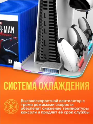 Зарядная станция и подставка для PlayStation 5 Slim эффективно охлаждают игровую консоль. Система охлаждения с вентилятором поддерживает оптимальную температуру, предотвращая перегрев даже при длительной работе. Это важно для геймеров, часто использующих PlayStation 5 в интенсивном режиме.