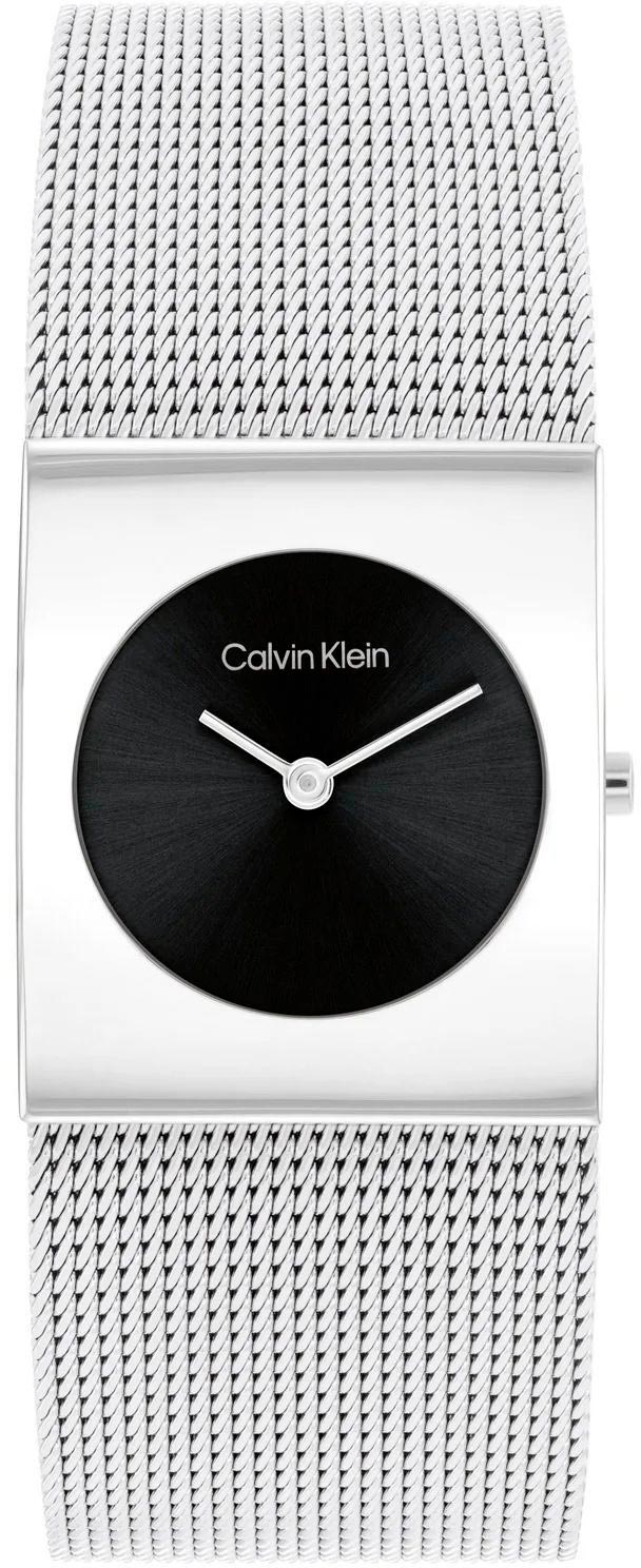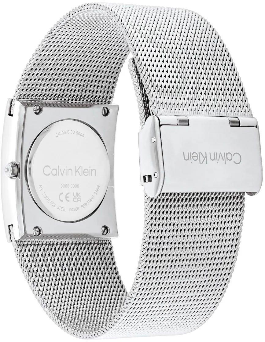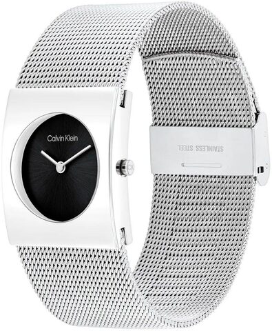 Гладкая заводная головка украшена логотипом ''CK''. Стальной браслет миланского плетения с регулируемой застежкой, украшенной логотипом бренда Calvin Klein.